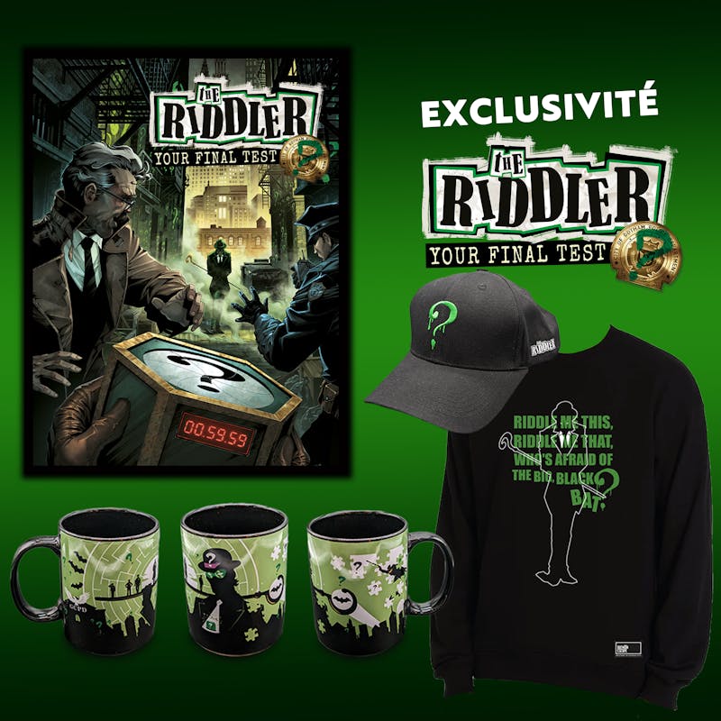 Découvrez la gamme exclusive de produits de la salle The Riddler : Your Final Test, disponible uniquement à la boutique de Batman Escape. Plongez dans l'univers mystérieux de l'Homme-Mystère avec nos mugs, T-shirts, sweats et casquette, arborant des designs captivants inspirés du Riddler.